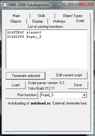 Nejprve musíme mít daný script, např. mining.sc. V injectu tedy vybereme záložku Script, poté klikneme na tlačítko Load a vybereme soubor mining.sc. Dole vedle Run function: se nám zobrazí název spustitelného scriptu, takže si vybereme např. Kopej a klikneme na Run function. A skript by měl běžet. Pokud ho budeme chtít vypnout, stačí běžící script vybrat z horního okna, označíme ho a klikneme na tlačítko Terminate selected.